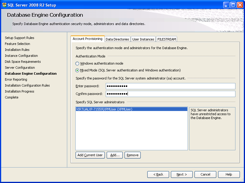 Használjunk vegyes módú felhasználó azonosítást. Azaza, adjuk meg az "sa" szuperfelhasználó jelszavát. Első esetben használhatjuk ezt a felhasználót a SmartStorage konfigurálásához, és ha működik, később egy másik felhasználóval, jobb biztosági szintet elérve használhatjuk SQL szerverünket: