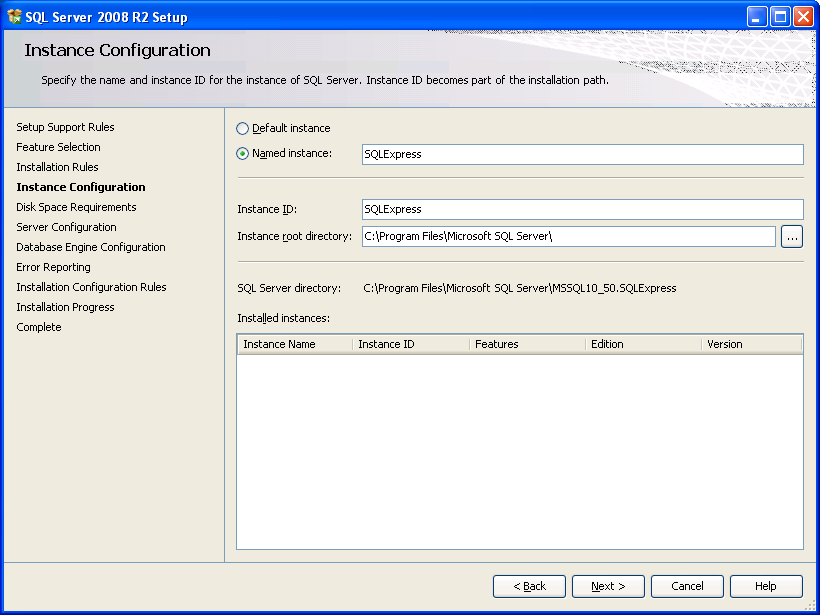 A telepített példány nevét, ha lehet hagyjuk alapértelmezés szerint. Ha a "Deafault instance" opciót választjuk, akkor a szerver nevének megadásakot nem kell megadnunk a szolgáltatás példányának nevét: <ip / vagy gépnév>[\<példány>]. Helyi gép esetén "." (pont), localhost vagy 127.0.0.1 jelenti a helyi gépet.