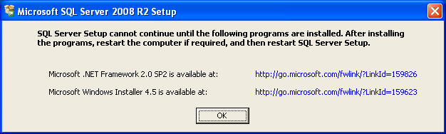 Az MSSQL szerver telepítésére szükségünk lesz, ha nem rendelkezünk egy telepített verzióval. Ahogy a következtő képen is látható, az SQL szerver telepítése szoftveres előfeltételekhez között, de a hiányzó komponenseket a linkekről könnyen letölthetjük és telepíthetjük (a telepítő csomag figyelmeztet a hiányzó elemekre):