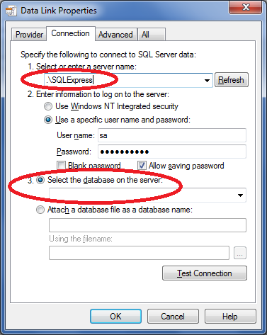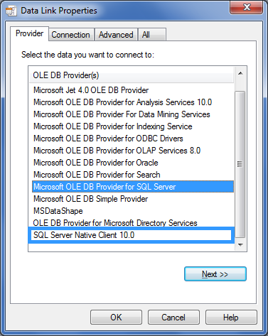 A képen látható és kékkel megjelölt kapcsolat szolgáltatók közül választhatunk. Az "SQL Server Native Client" akkor érhető el gépünkön, ha van telepített MS SQL 2005/2008 szerver a gépünkön. A "Microsoft OLE DB Provide for SQL Server" minden Windows XP, Vista és Windows 7 számítógépen elérhető. Amennyiben az "SQL Server Native Client" elérhető, válasszuk azt!