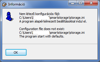 Új, induló adatbázist az "Adatbázis karbantartó" programmal hozhatunk létre. Indítás: Start menü - Programok - Smart Storage 2.0 for MSSQL - Adatbázis karbantartó menüponttal. Ha még nem indítottunk el semmilyen programot a SmartStorage rendszerből, akkor a következő üzenet jelenik meg előttünk:
